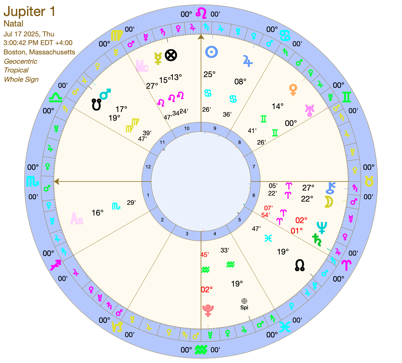 We have a beautiful Jupiter, exalted in Cancer, in its heliacal rising phase. The heliacal rising phase is when a planet reappears in visibility in the sky after its Cazimi and Combustion phase where it travels into the heart of the Sun where it is recharged. A planet in its Heliacal rising phase is a planet that has been refreshed, renewed, and recharged. Extra potent since this Jupiter is exalted, this is a very happy healthy Jupiter ready to deliver.