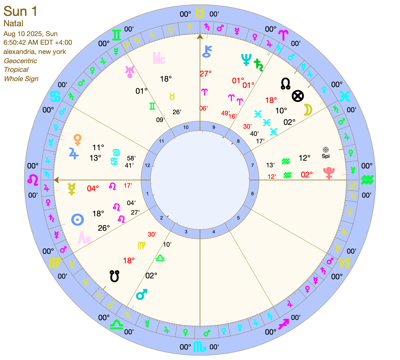 In this chart we have a freshly risen, unaspected Sun in domecile in Leo. Poured at daybreak and infused with the morning beams of the rising Sun, this oil is sure to put you right in the drivers seat of your life, ready to shine in all your glory.